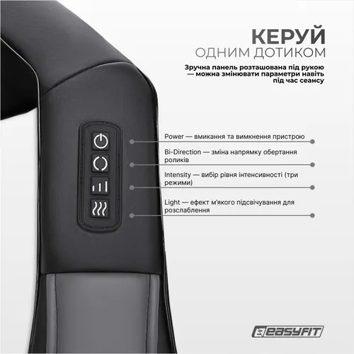 EasyFit Shiatsu – це ефективний, безпечний та ергономічний масажер, який забезпечує якісний шіацу-масаж та вібраційний вплив. Він створений для тих, хто цінує зручність і результат у реабілітації м’язів та знятті напруги після навантажень.