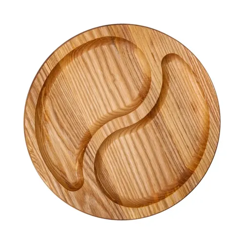 Дерев’яна менажниця — це функціональний та естетичний аксесуар для сервіровки столу, який поєднує у собі практичність, екологічність та вишуканий дизайн. Менажниця дерев’яна 25 см кругла на 2 секції T45W250 виготовлена з натурального ясена, що забезпечує міцність та довговічність виробу. Її компактний розмір та зручний поділ на дві секції дозволяють комфортно подавати різні закуски, соуси та інші страви, зберігаючи порядок і привабливий вигляд сервіровки.