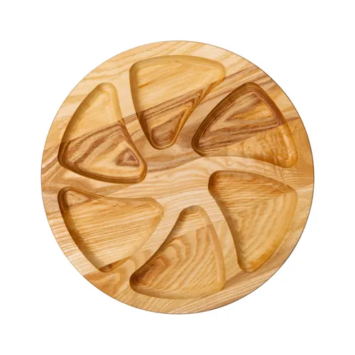 Дерев’яна менажниця діаметром 30 см виготовлена з натурального ясена і призначена для комфортної та естетичної подачі різноманітних страв. Кругла форма з шістьма окремими секціями дозволяє зручно розділяти різні продукти, зберігаючи їхні смакові якості та візуальну привабливість.