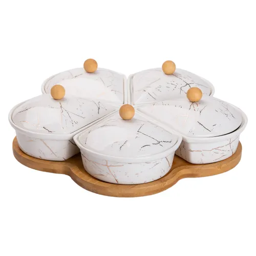 Менажниця керамічна на обертовій підставці 5 секцій біла HP-1217 представляє собою функціональний та стильний набір для подачі закусок, соусів та десертів. Виготовлена з якісної кераміки, вона відрізняється міцністю та безпекою для здоров'я. Керамічні чаші легко миються і не вбирають запахи, що робить їх ідеальним вибором для багаторазового використання.