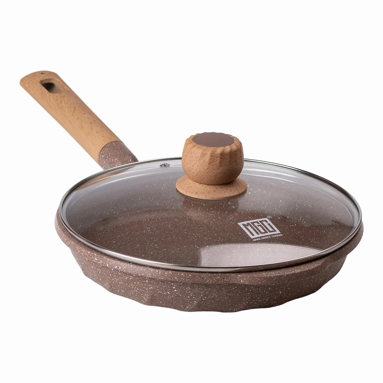 Ця модель виділяється поєднанням мармурового антипригарного покриття та алюмінієвого корпусу з мультишаровим дном, що рідко зустрічається у класичних сковорідках середньої цінової категорії. Крім того, наявність скляної кришки з отвором для пари є практичним доповненням для комфортного приготування.