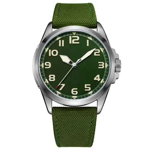 Друга – це поєднання шкіряного та нейлонового ремінця, що забезпечує міцність і водночас комфорт, дозволяючи шкірі дихати. Крім того, зелений колір ремінця виділяє годинник серед інших моделей, надаючи стильного вигляду та індивідуальності власнику.
