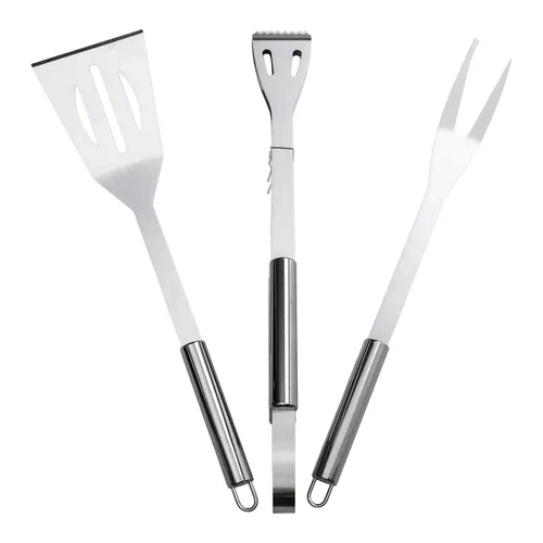 До набору входять три основних предмети, необхідні для професійного і домашнього барбекю: лопатка для перевертання і зняття продуктів з гриля, виделка для надійного утримання м'яса під час приготування та щипці для захоплення і переміщення інгредієнтів. Такий набір дозволяє ефективно і зручно готувати різноманітні страви на грилі або мангалі.