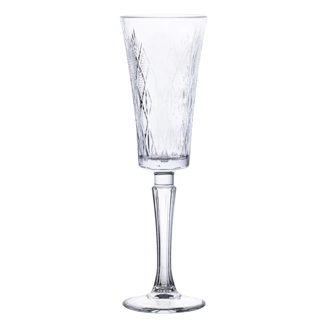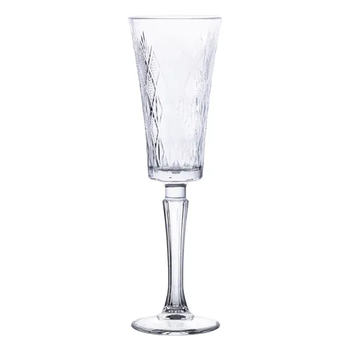 Набір келихів для шампанського складається з шести виробів, виконаних із прозорого скла, яке володіє високою міцністю та прозорістю. Кожна модель прикрашена рельєфним візерунком з геометричними гранями, що надають елегантність і оригінальність зовнішньому вигляду. Витягнута форма чаші та вишукана висока ніжка з вертикальними гранями створюють візуальну легкість, а також зручність при триманні келиха.