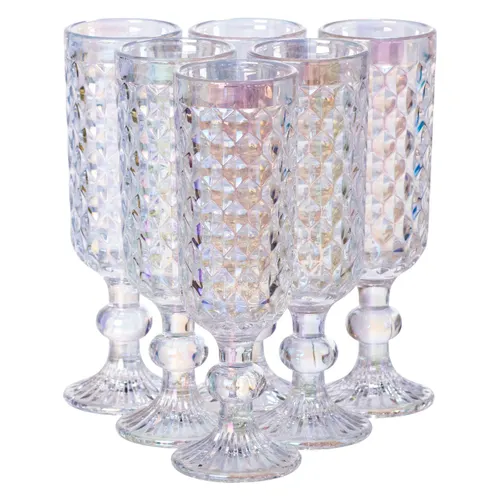 Набір келихів для шампанського представлений шістьма вишуканими виробами з прозорого скла, кожен об'ємом 160 мл. Особливість конструкції полягає у виразній ребристій фактурі, що надає келихам стильного зовнішнього вигляду та додаткового комфорту при триманні в руці. Завдяки класичній формі та універсальному елегантному дизайну, ці келихи ідеально підходять не лише для подавання шампанського та інших ігристих вин, а й для коктейлів чи чистої води, що робить їх універсальним аксесуаром на будь-яке свято або сімейну вечерю.