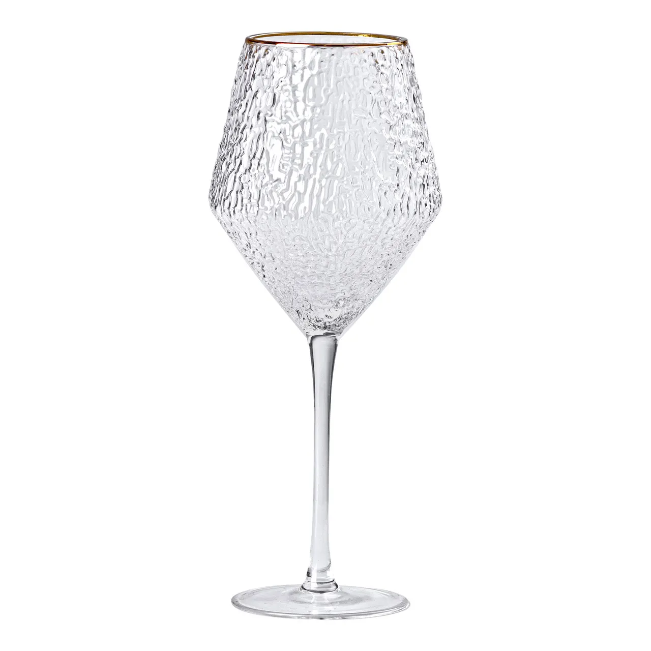 Набір келихів для вина включає шість вишуканих келихів об'ємом 600 мл кожен. Виготовлені з якісного скла з фактурною поверхнею, вони створюють цікаву гру світла, що надає посуді особливого шарму та естетичної привабливості. Келихи прикрашені вишуканою золотою облямівкою, яка підкреслює вишуканість і робить їх чудовим вибором для особливих випадків та урочистостей.