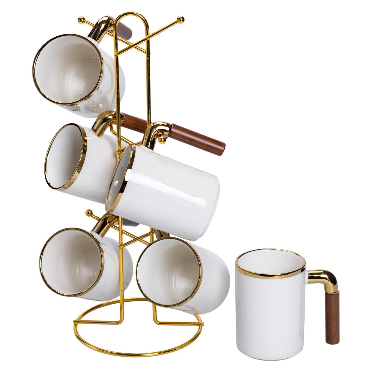 Металева підставка золотистого кольору надійна і стійка, має висоту 39 см та діаметр 15 см, що дозволяє компактно зберігати весь набір, звільняючи місце на кухонному столі. Завдяки зручним гачкам чашки підвішуються на підставку, забезпечуючи швидкий доступ до кожної з них і допомагаючи підтримувати порядок. Такий дизайн є оптимальним рішенням для щоденного використання, а також святкових подій.