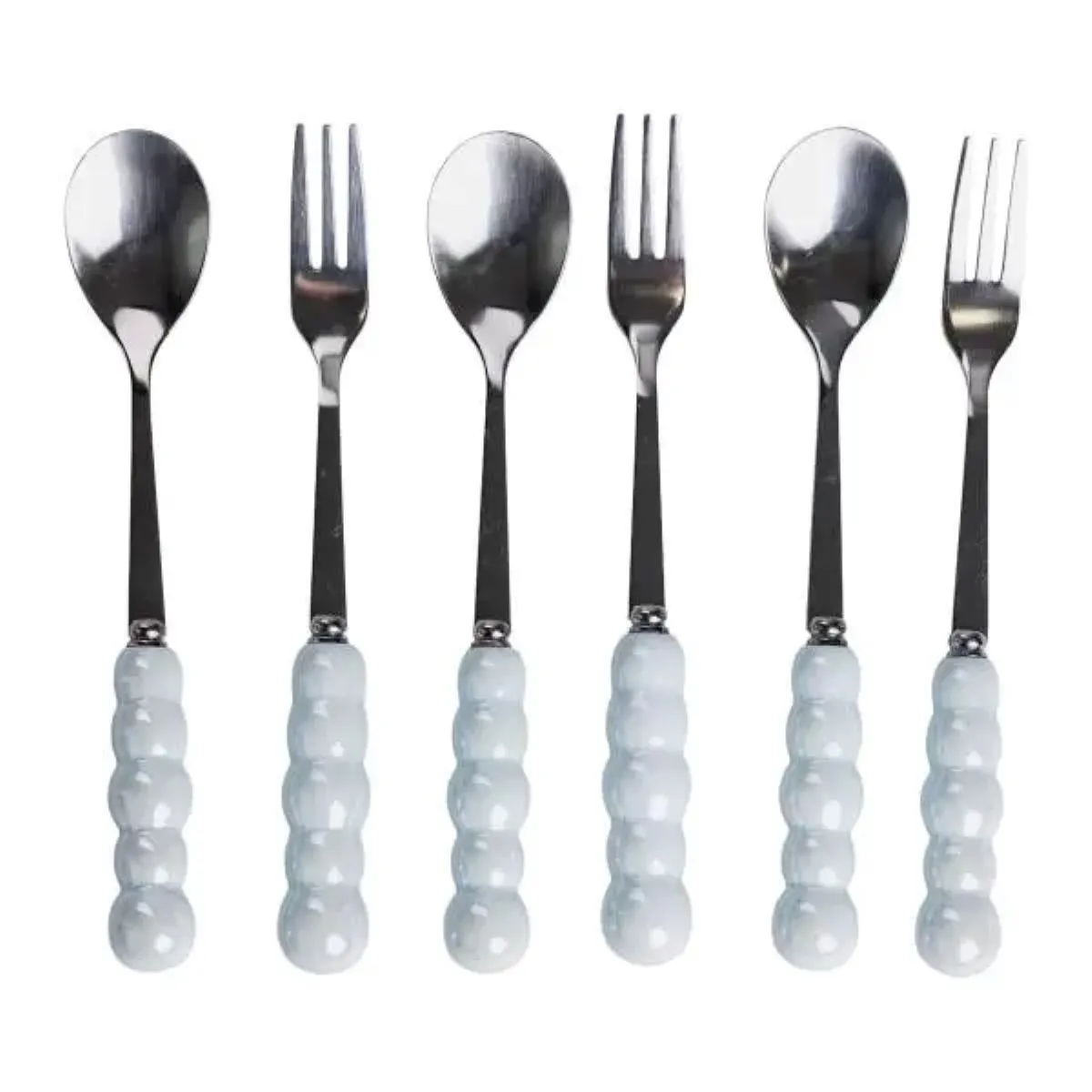 Для виготовлення десертних приборів використана високоякісна нержавіюча сталь із дзеркальною поверхнею. Це забезпечує довговічність, стійкість до корозії та легкість у догляді. Керамічні ручки, виконані в блакитному кольорі з візерунком, що нагадує перлини, надають набору особливого шарму та забезпечують надійний хват.