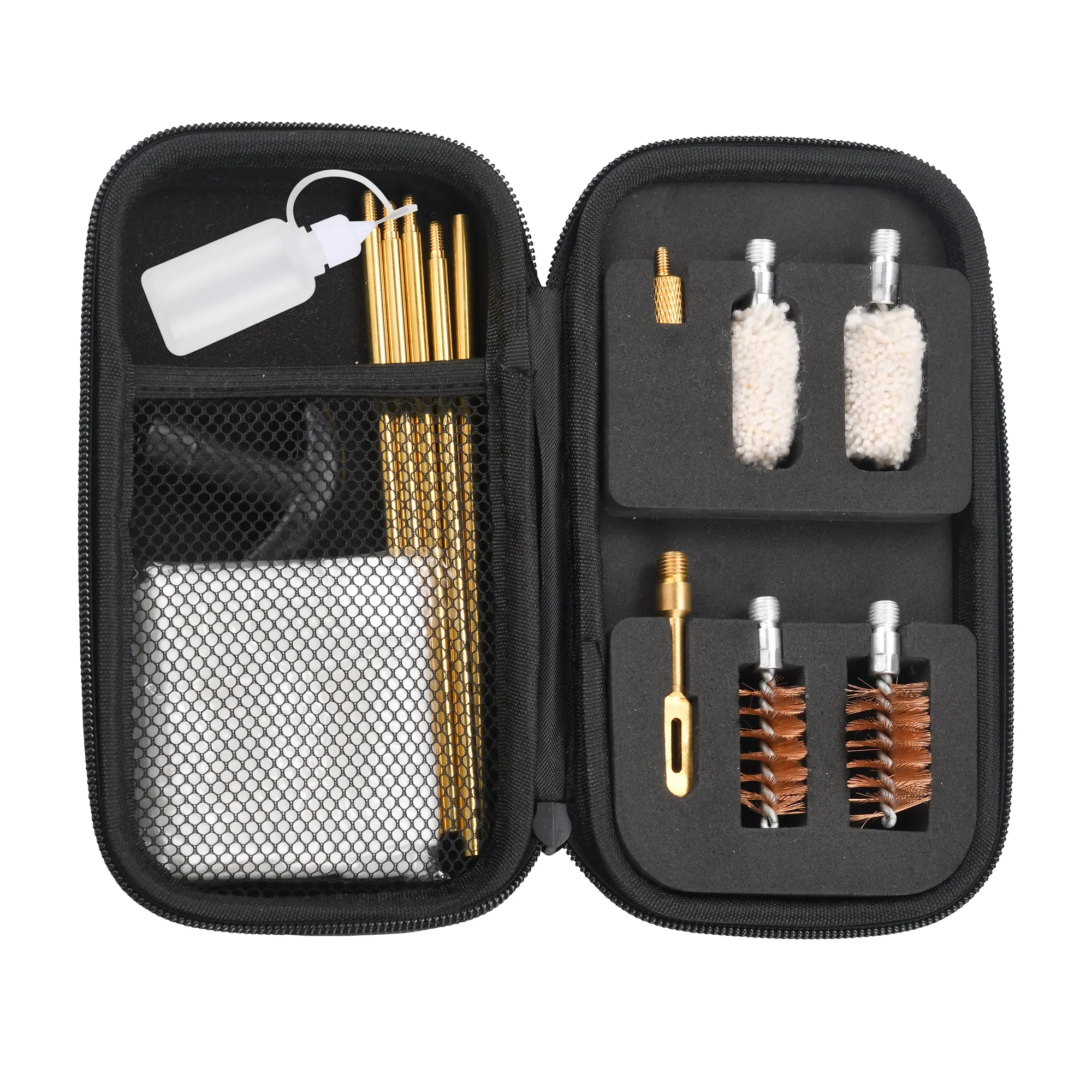 Щітки з алюмінієвим каркасом і бронзовою щетиною забезпечують акуратне, але ефективне видалення забруднень з внутрішньої поверхні ствола. Мопи з бавовни та латунні насадки з прорізами прекрасно справляються з залишками сажі й забруднень.
