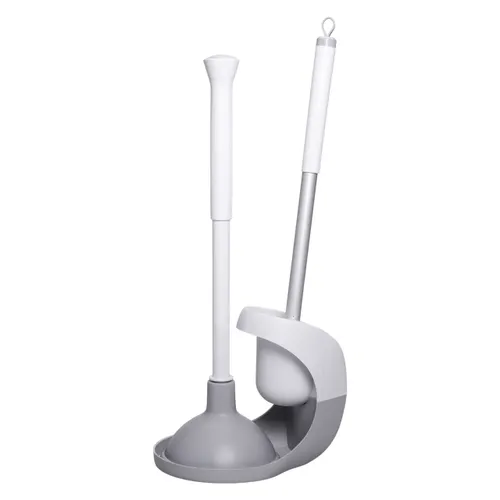 Набір для чищення унітазу включає в себе йоршик та вантуз, які зручно розташовані в компактному тримачі. Ергономічний дизайн забезпечує комфортне використання та зручне зберігання, а поділ тримача на два відсіки запобігає контакту між вантузом і щіткою, що підвищує гігієнічність.