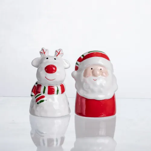 Набір для спецій з порцеляни "New Year" включає дві стильні ємності, виконані у вигляді новорічних персонажів — олень з червоним носом і шарфом, а також Санта-Клаус з традиційною шапкою і бородою. Такі фігурки роблять набір не лише функціональним, а й декоративним елементом, який створить святковий настрій на вашій кухні або обідньому столі.