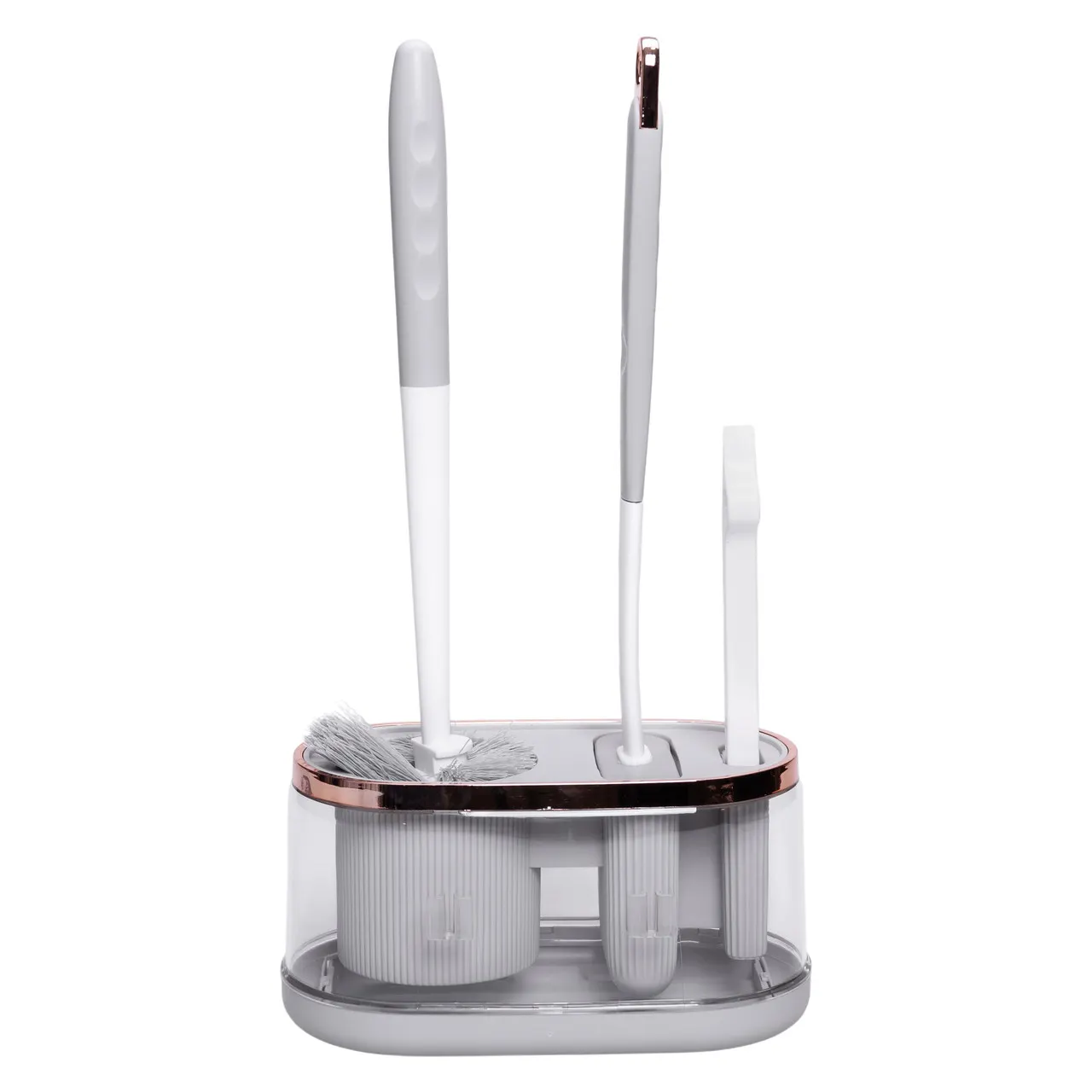 До комплекту входять два ершики та додаткова щітка: боковий ершик з щільною щетиною для ретельного очищення унітазу та важкодоступних поверхонь, силіконовий ершик, який забезпечує делікатне, але ефективне прибирання, не пошкоджуючи фаянс, а також додаткова компактна щітка для чищення кутів плитки та важкодоступних швів у ванній.