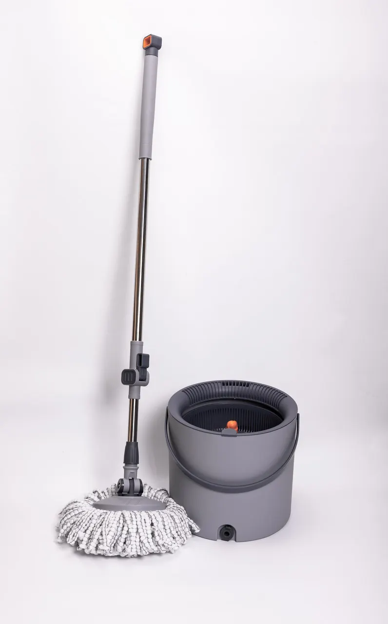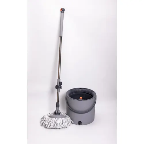 Відро виготовлене з міцного пластику об'ємом 10 літрів та оснащене внутрішнім металевим кошиком для віджиму насадки без контакту з водою та брудом. Така конструкція допомагає економити час і зусилля під час прибирання, зберігаючи руки чистими і сухими. Швабра забезпечена прогумованою ручкою, що гарантує надійний хват під час роботи.