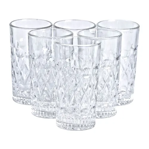 Набір фігурних склянок представляє собою комплект із шести виробів, виконаних з міцного та прозорого скла. Кожна склянка має об'єм 300 мл, висоту 12,5 см і діаметр 6,5 см, що забезпечує зручність у використанні та підходить для різних напоїв — від свіжовичавлених соків і лимонадів до коктейлів та прохолодних напоїв.