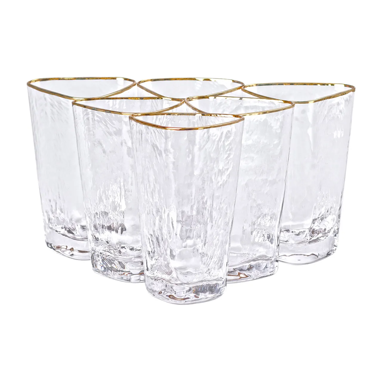 Цей набір складається з шести витончених склянок із прозорого скла, виконаних у сучасному мінімалістичному стилі. Трикутна форма кожного стакана є унікальною особливістю, що надає їм естетичної привабливості та вирізняє на фоні класичних моделей. Об'єм 450 мл дозволяє їх використовувати для широкого спектру напоїв: будь то освіжаюча вода, натуральні соки, лимонад чи коктейлі.