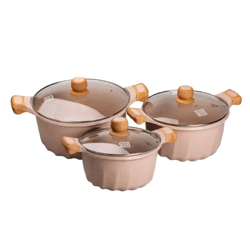 Використання литого алюмінію з багатошаровим дном забезпечує рівномірний нагрів, що сприяє якісному приготуванню їжі без пригорання. Антипригарне мармурове покриття дозволяє використовувати мінімальну кількість олії, що позитивно впливає на здоров’я та смак страв.