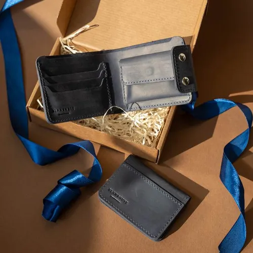 У комплект входять такі аксесуари: портмоне розміром 19 на 9 см, шкіряний кард-кейс 10 на 8 см, невеликий брелок 4 на 4 см та вітальна листівка формату 10 на 15 см. Усі вироби виконані з натуральної шкіри Crazy Horse, відомої своєю міцністю та унікальною фактурою.