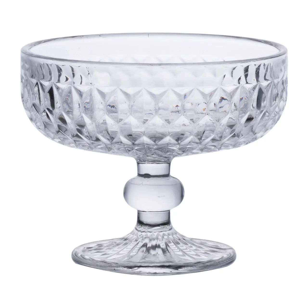 Креманки на ніжці виготовлені з прозорого скла, яке відрізняється чистотою та характерним блиском. Вироби мають фігурну форму з плавними вигинами, які надають їм виразного вигляду. Конструкція доповнена прозорою ніжкою, що забезпечує зручне утримання та стійкість на поверхні. Основні характеристики: Матеріал: скло; Об'єм: 300 мл; Висота: 10 см; Верхній діаметр: 11 см; Нижній діаметр: 7 см; Призначення: для фруктів, морозива, десертів. Завдяки широкій чаші креманки підходять для подачі десертів, морозива, фруктів або желе. Прозоре скло дозволяє естетично презентувати вміст, а гладка внутрішня поверхня полегшує догляд. Форма сприяє комфортному використанню, а ніжка не дає теплу рук нагрівати вміст. Креманки підходять як для щоденного використання, так і для сервірування святкового столу. Їх можна мити вручну або в посудомийній машині. Вироби поєднують зручність, стійкість і привабливу форму для подачі десертів у домашніх і професійних умовах.