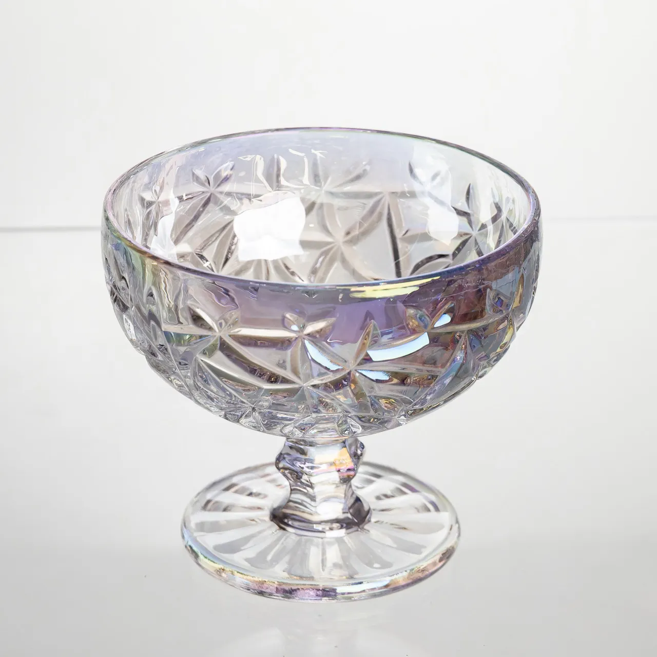 Креманки на ніжці призначені для подавання десертів, фруктів і холодних закусок. Вироби виготовлені з кришталевого скла та мають продумані пропорції, що забезпечують зручність використання й акуратний зовнішній вигляд сервірування. Чаша прикрашена багатогранним візерунком у стилі вінтажного кришталю, який створює гарну гру світла та підкреслює прозорість матеріалу. Хвилястий край надає посуду витонченості, а ніжка з основою доповнена дрібним геометричним рельєфом, що гармонує з формою чаші. Основні характеристики креманок: Матеріал: скло; Об'єм: 340 мл; Висота: 10 см; Діаметр: 12 см; Призначення: для фруктів, морозива, десертів. Набір креманок поєднує зручність, універсальність і виразний зовнішній вигляд, даючи змогу акуратно та красиво подати десерти, фрукти або холодні страви. Він підійде як для повсякденного сервірування, так і для приймання гостей, додаючи столу акуратність і легку декоративність без зайвої химерності.
