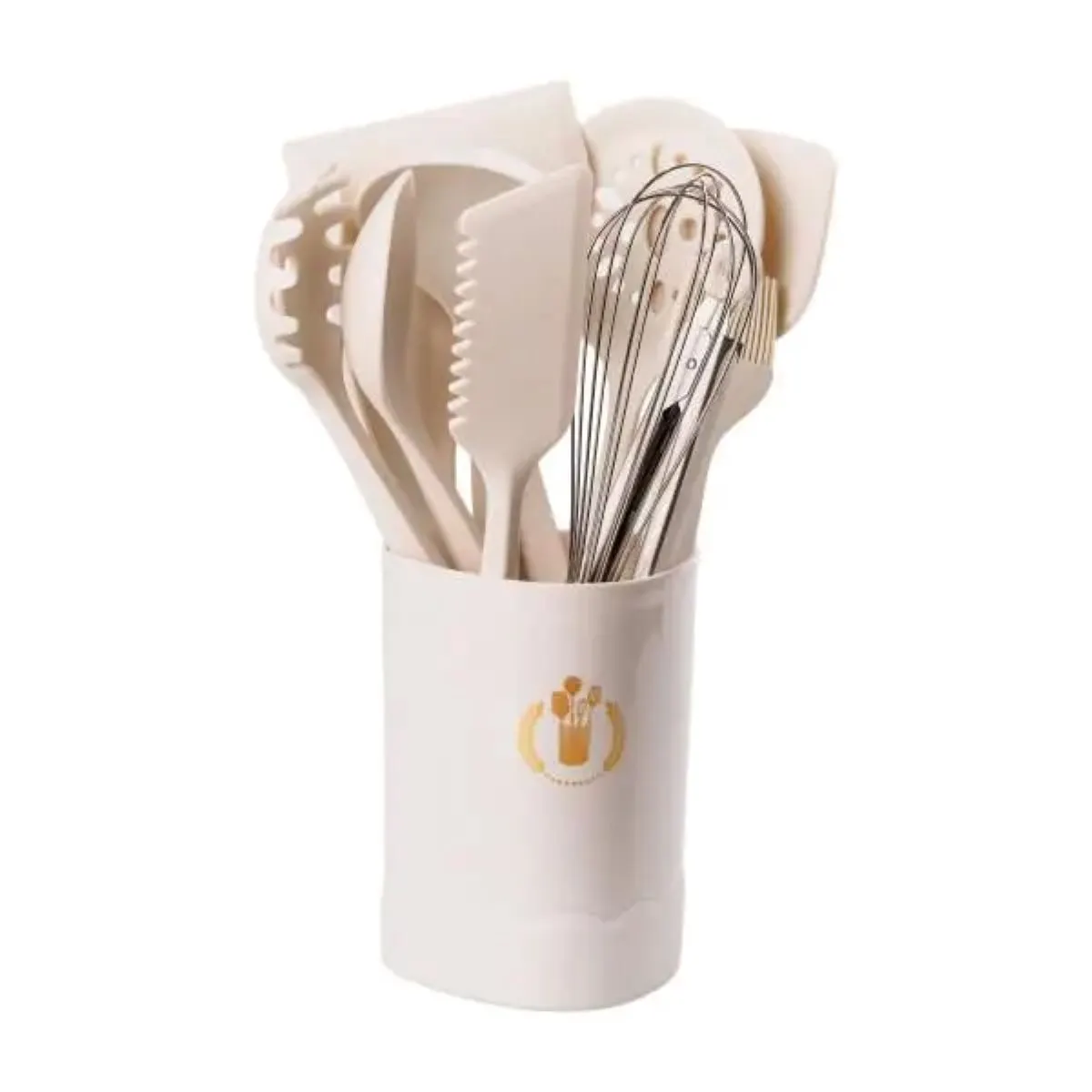 Набір кухонного приладдя на підставці складається з 12 предметів, кожен з яких виконаний з урахуванням зручності та довговічності. До складу входять найнеобхідніші інструменти для приготування різноманітних страв: ложки, лопатки, вінчик, шумівка та інші аксесуари. Всі робочі частини виготовлені з харчового пластику з силіконовим покриттям, що забезпечує м’яку та безпечну взаємодію з посудом.