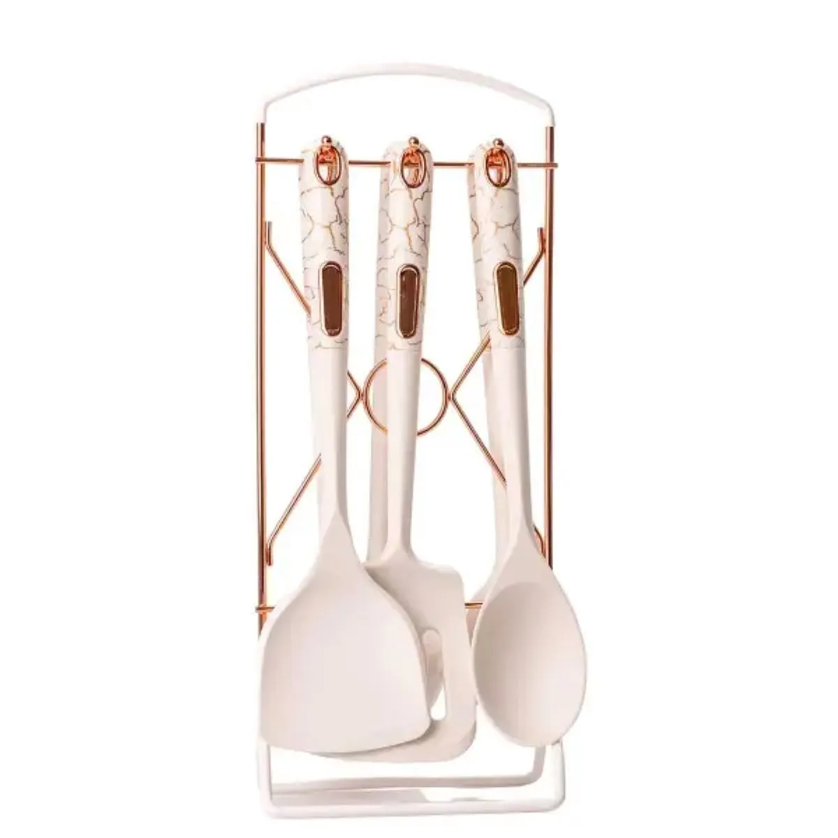 Даний набір кухонного приладдя на підставці включає шість функціональних аксесуарів, виконаних у стилі мармурового дизайну. У комплект входять половник, кухонні лопатки, поварська ложка, шумівка, ложка для спагеті та зручна настільна підставка. Кожен елемент виготовлений із харчового пластику з силіконовим покриттям, що забезпечує довговічність і безпеку при використанні.