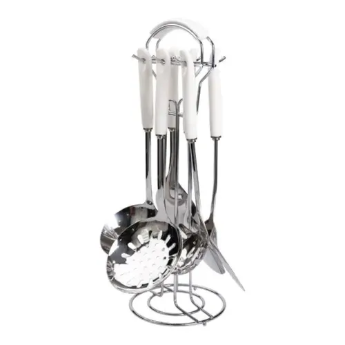 Набір кухонного приладдя на підставці складається з семи ретельно відібраних предметів, виготовлених із високоякісної нержавіючої сталі. Завдяки цьому матеріали стійкі до корозії та мають тривалий термін служби, що значно підвищує надійність кожного інструменту. Ручки виконані з білої кераміки з сріблястими елементами, що забезпечує комфортний та надійний захват під час роботи.
