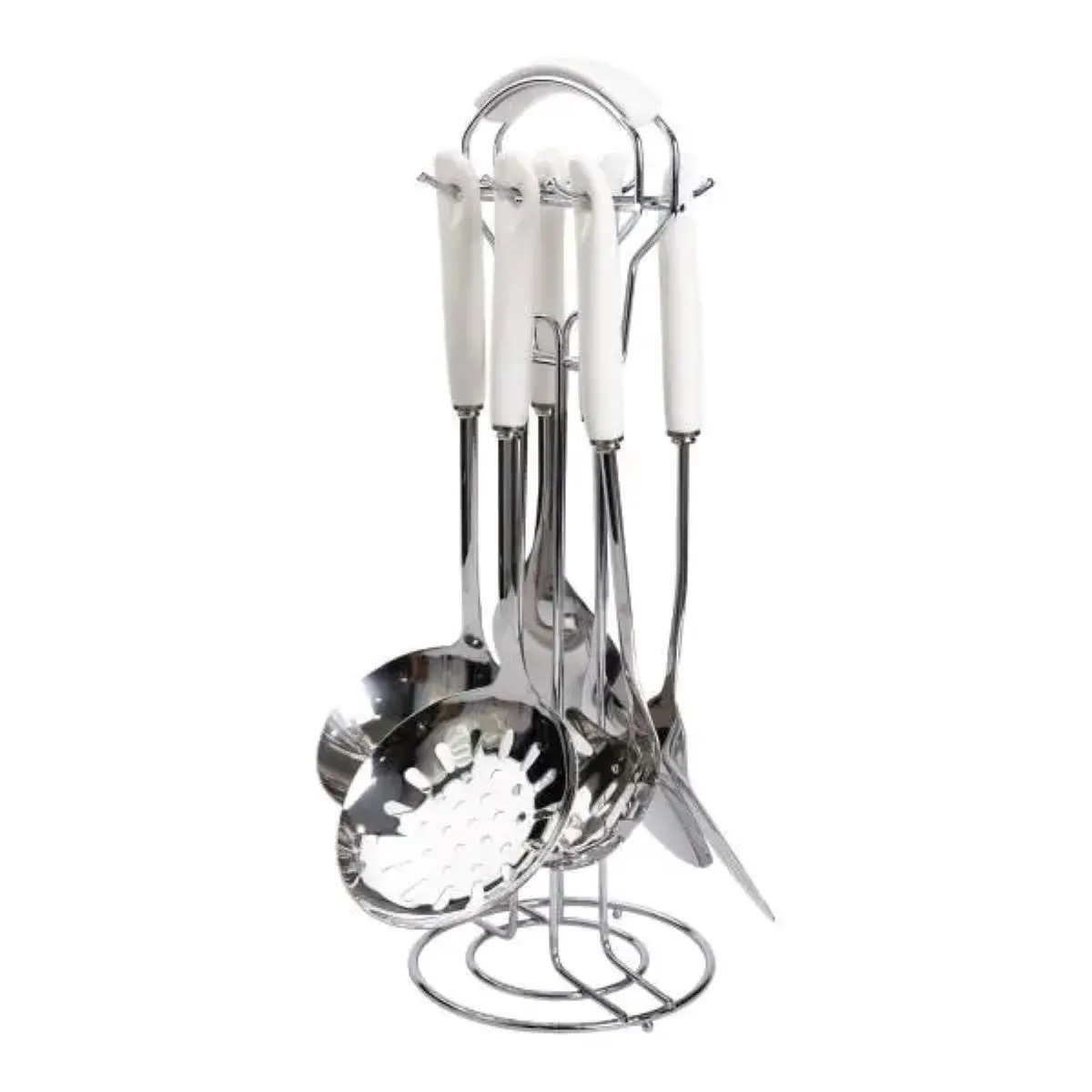 До комплекту входять основні аксесуари для приготування та подачі їжі: кухонні лопатки, половник, шумівка, ложка для спагеті та поварська ложка. Кожен предмет адаптований за формою і розміром для зручності та ефективності використання. Додатково набір містить настільну металеву підставку, яка дозволяє компактно та ергономічно зберігати інструменти, заощаджуючи простір на кухонному столі.