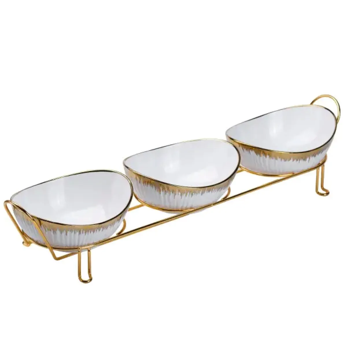 Керамічні салатниці відрізняються підвищеною стійкістю до механічних пошкоджень, а гладка поверхня полегшує процес догляду. Металева підставка додатково надає виробу вишуканість і надійність, зберігаючи стабільність при розстановці на столі. Завдяки універсальному дизайну набір прекрасно впишеться як у повсякденне оточення, так і в святкову сервіровку.