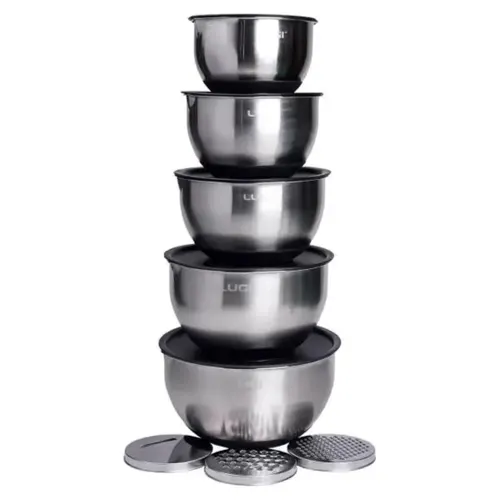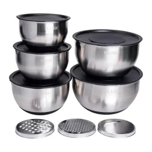 Використання знімних терок покращить і пришвидшить процес приготування, дозволяючи подрібнювати інгредієнти безпосередньо в мисці без додаткового посуду. Для безпеки кришок уникайте високих температур і не рекомендуйте їх використовувати в мікрохвильовій печі чи духовці. Зберігайте набір у сухому місці, щоб мінімізувати контакт із вологістю, і уникайте сильних ударів або падінь.