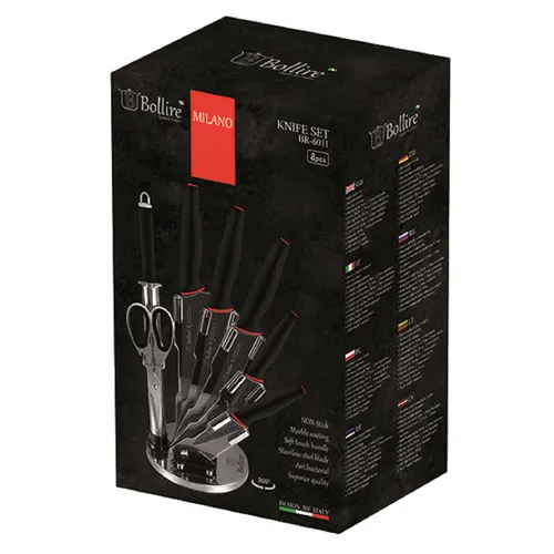 Набір ножів Milano BOLLIRE складається з восьми функціональних предметів, необхідних для комфортної та ефективної роботи на кухні. До комплекту входять різні кухонні ножі, призначені для різних задач: від чищення овочів до нарізання хліба та м'яса. Також набір містить ножиці, мусат для заточування та зручну підставку для зберігання всіх елементів. Всі вироби виконані в одному стилі з чорним лезом, що надає комплекту сучасного і стильного вигляду.