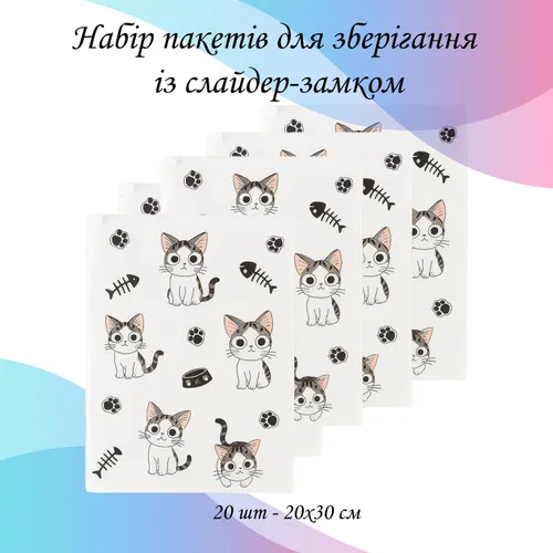 Набір пакетів для зберігання із слайдер-замком "Котики", 20 шт - 20х30 см LoveYouHome