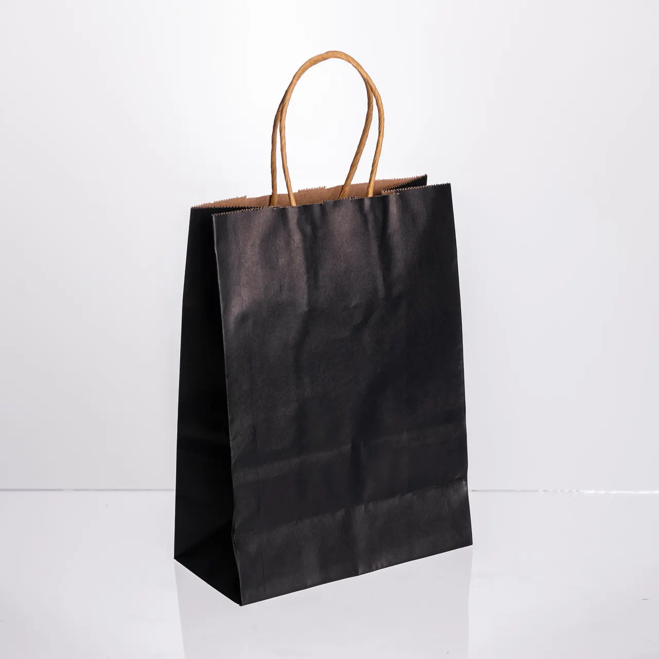 Ручки виконані з скрученого паперового шнура, що гарантує надійний хват і комфорт під час перенесення. Колір пакетів — чорний, що додає стильності та універсальності, дозволяючи використовувати їх для різних свят і заходів.