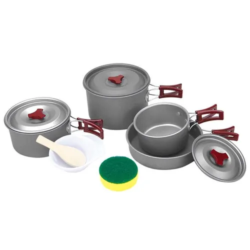 Набір посуду включає чотири ємності, половник, ложку, губку для миття посуду. Є також чохол для зберігання та перенесення виробів. Дуже зручний комплект для туристичних цілей. До нього входять: дві каструльки, казанок, а також сковорідка. Всі ці предмети можуть бути компактно складені один на один, і не займатимуть багато місця в рюкзаку. Комплект допоможе зробити процес кулінарії на природі більш простим та швидким. Рукояті посуду можуть складатися, що сприяє ще більшій зручності. Комплект добре адаптований для експлуатації в польових умовах.