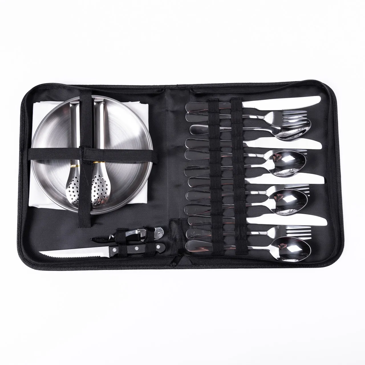Виготовлені з високоякісної нержавної сталі столові прибори забезпечують довговічність і стійкість до корозії, що особливо важливо для використання на відкритому повітрі. Вага набору становить всього 1,7 кг, що робить його легким і зручним для перенесення в поїздках і походах.