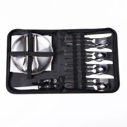 Набір посуду для пікніка на 4 особи представляє собою універсальний комплект з 24 предметів, призначений для комфортного відпочинку на природі. До нього входять тарілки, ножі, вилки, ложки, серветки, а також допоміжні аксесуари, такі як щипці, кухонний ніж і штопор з відкривачкою. Всі предмети компактно розміщені в міцному кейсі розміром 32×25×5 см, що забезпечує зручність транспортування та зберігання.