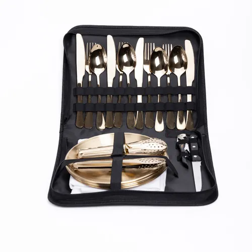 Набір посуду для пікніка HP-21-2 вирізняється збалансованим поєднанням функціональності та компактності. Його дизайн із золотистим відтінком підкреслює стиль і вишуканість, що рідко зустрічається у аналогічних комплектах. Крім того, наявність усіх необхідних компонентів і додаткового кухонного ножа з щипцями та відкривачкою гарантує багатофункціональність.
