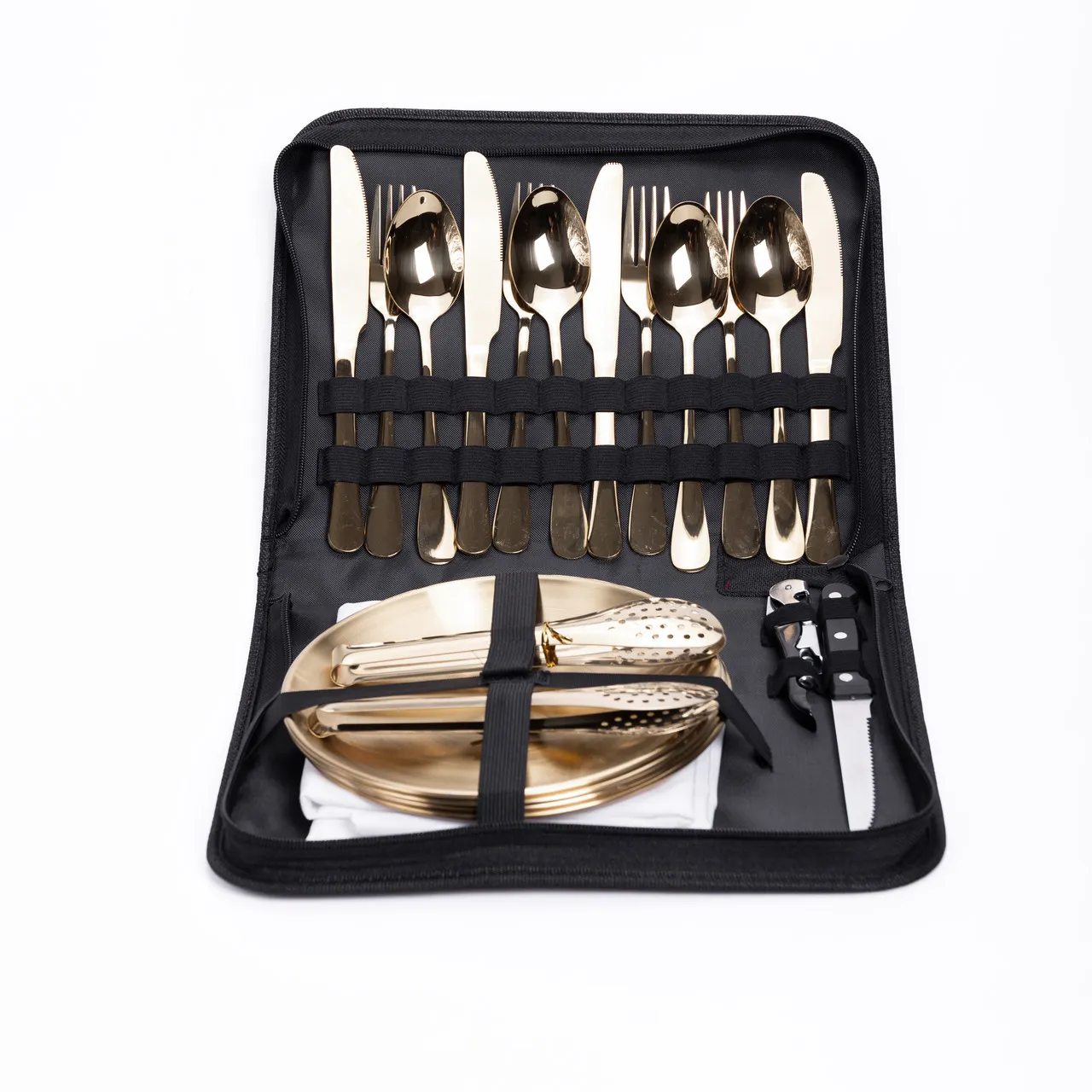 Усі предмети виготовлені з високоякісної нержавної сталі золотистого кольору, завдяки чому комплект відзначається довговічністю, стійкістю до корозії та механічних пошкоджень. Вага набору становить усього 1.7 кг, що робить його легким для переноски, а розмір кейса 32×25×5 см дозволяє зручно розмістити його у багажнику автомобіля або рюкзаку.