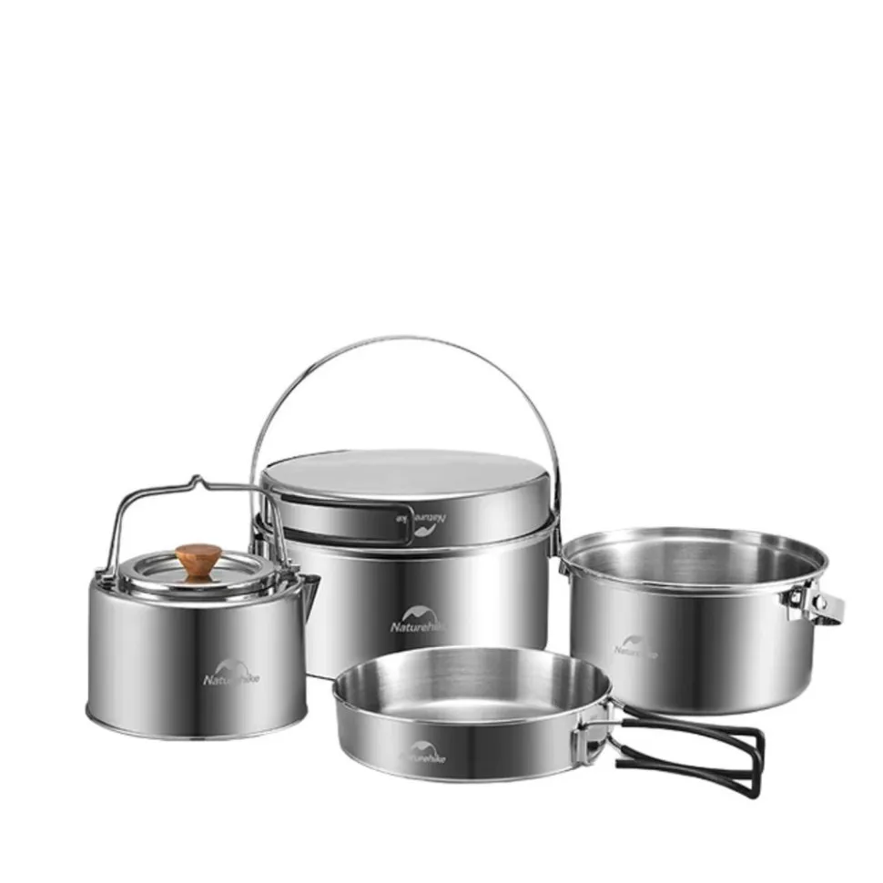 Опис набору посуду (каструля, казанок, сковорідка, чайник) Naturehike NH22CJ005 з нержавіючої сталі
