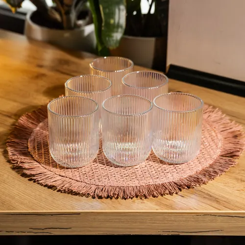 Функціональність і стиль в одному наборі. Ці склянки стануть універсальним рішенням для щоденного використання — вдома, в офісі або в закладах громадського харчування. Вертикальне рифлення й класична форма роблять подавання напоїв естетичнішим і зручнішим. Основні характеристики набору склянок для лимонадів, соку, води, коктейлів: Тип: склянки для напоїв Кількість: 6 штук Об'єм: 250 мл Матеріал: товсте скло Висота: 9 см Діаметр: 7 см Дизайн: ребристий Особливості набору скляних склянок: Рельєфна поверхня робить склянки зручнішими в утриманні та запобігає ковзанню, особливо у разі вологих рук. Прозоре кольорове скло середньої товщини не тільки має гарний вигляд, але й дає змогу легко контролювати рівень напою. Склянки стійкі на столі, легко миються вручну та підходять для посудомийної машини. Нейтральний дизайн дає змогу поєднувати їх із будь-яким іншим посудом — від повсякденного до святкового. Практичний і стильний набір, який підійде як для повсякденного використання, так і для сервірування столу до приходу гостей. Ці склянки приємно тримати в руці, зручно використовувати та легко поєднувати з будь-яким посудом. Чудовий вибір для тих, хто цінує комфорт і акуратність у деталях.