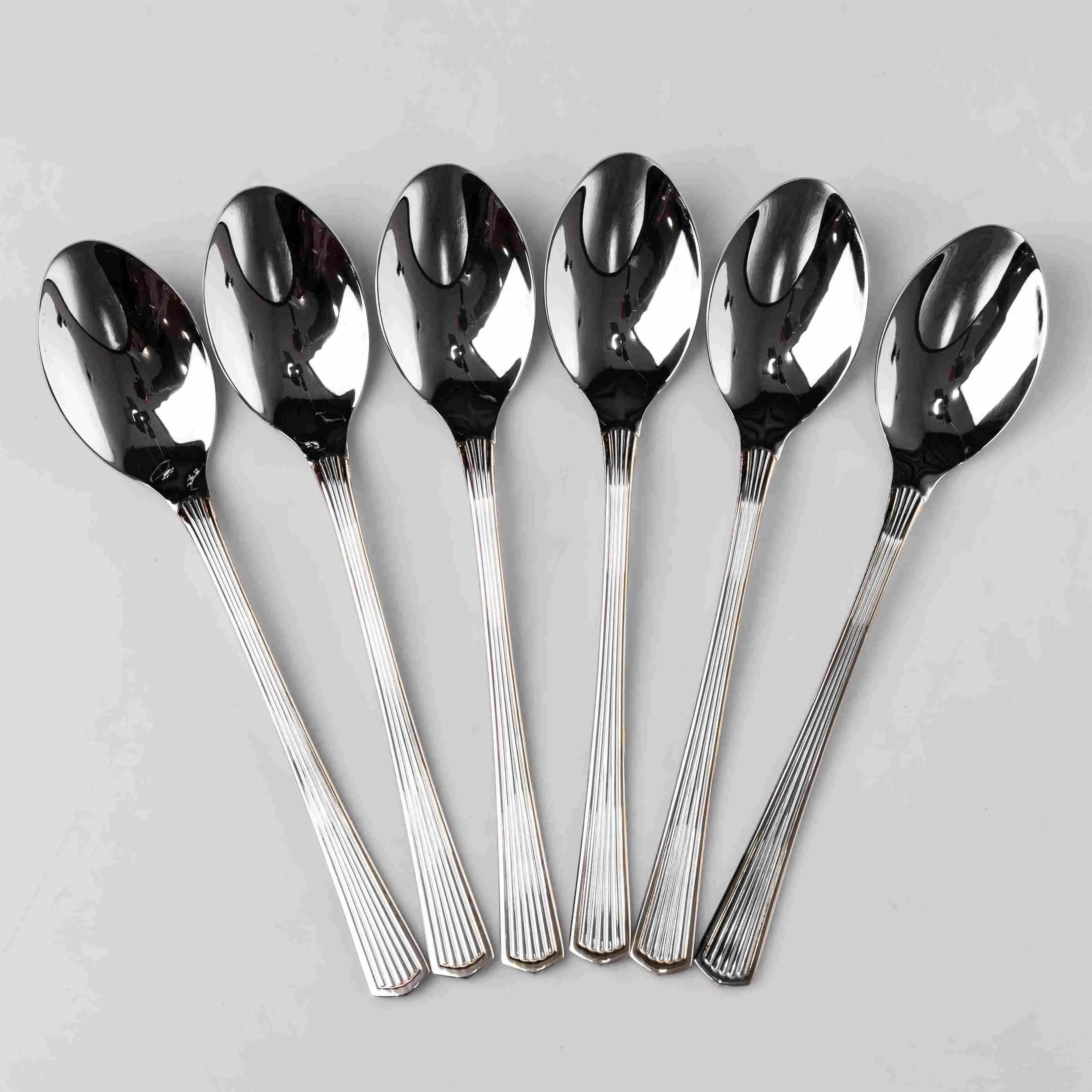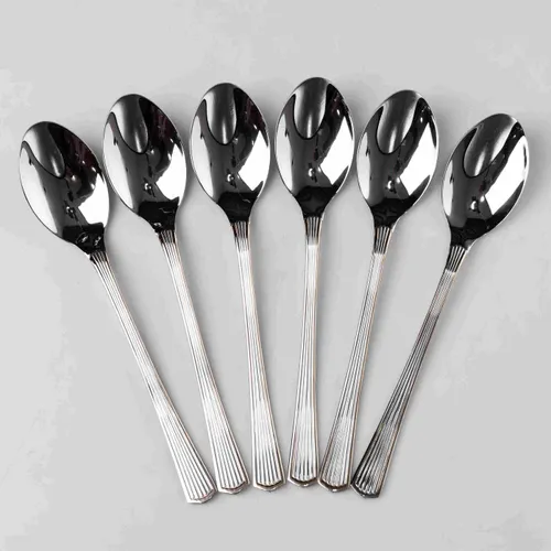 Класичні столові прибори із дзеркальним поліруванням. Дизайн поєднує в собі строгі лінії та ергономічну форму, що робить прилади універсальним доповненням до будь-якого кухонного сервізу. Переваги: Якісний матеріал: Виготовлені із харчової нержавіючої сталі. Матеріал стійкий до корозії, окислення та механічних пошкоджень. Не вступає у реакцію з продуктами та не впливає на смакові якості страв. Дзеркальне полірування: Ретельна обробка поверхні забезпечує бездоганний блиск та гладкість. Покриття зберігає естетичний вигляд після тривалого використання. Оптимальний розмір: Повнорозмірні ложки довжиною 21 см зручні для перших страв та гарнірів. Практичність догляду: Прибори підходять для миття в посудомийній машині. Гладка поверхня перешкоджає нагромадженню бактерій і легко очищається. Характеристики: Матеріал: нержавіюча сталь Довжина: 21 см Вага набору: 400 г
