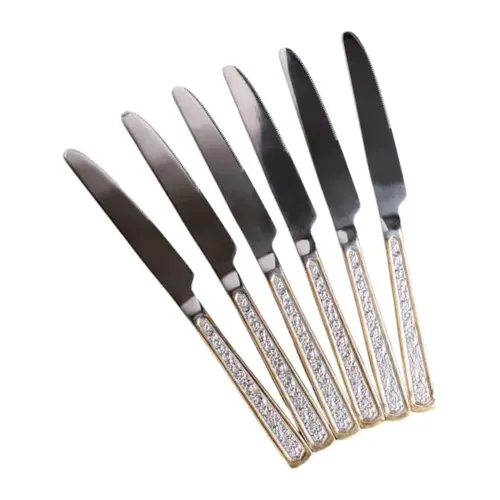 Набір столових ножів із 6 штук виконаний із високоякісної нержавіючої сталі з глянцевим хромованим та золотим покриттям, що забезпечує довговічність і презентабельний зовнішній вигляд. Кожен ніж має довжину 23 см і ширину 2 см, що робить їх зручними для повсякденного використання та святкових подій.