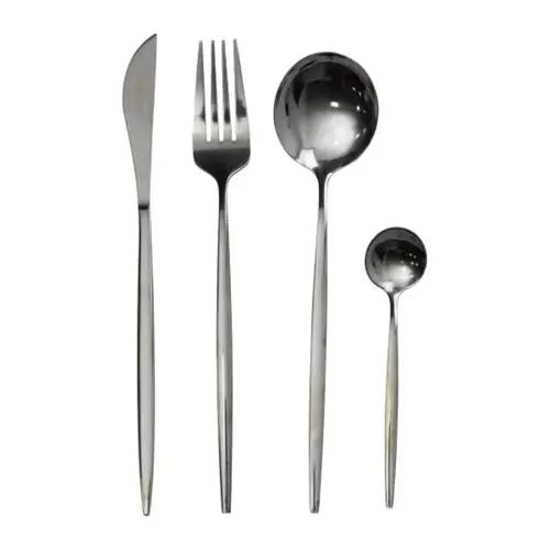 Набір столових приборів включає 24 предмети, призначених для сервірування шести персон. У комплект входять по шість стандартних столових ложок, чайних ложок, виделок і ножів, що забезпечує повне оснащення столу для сімейної вечері або святкового заходу. Усі вироби виготовлені з високоякісної нержавіючої сталі з дзеркальною поверхнею, що гарантує довговічність і практичність у використанні.