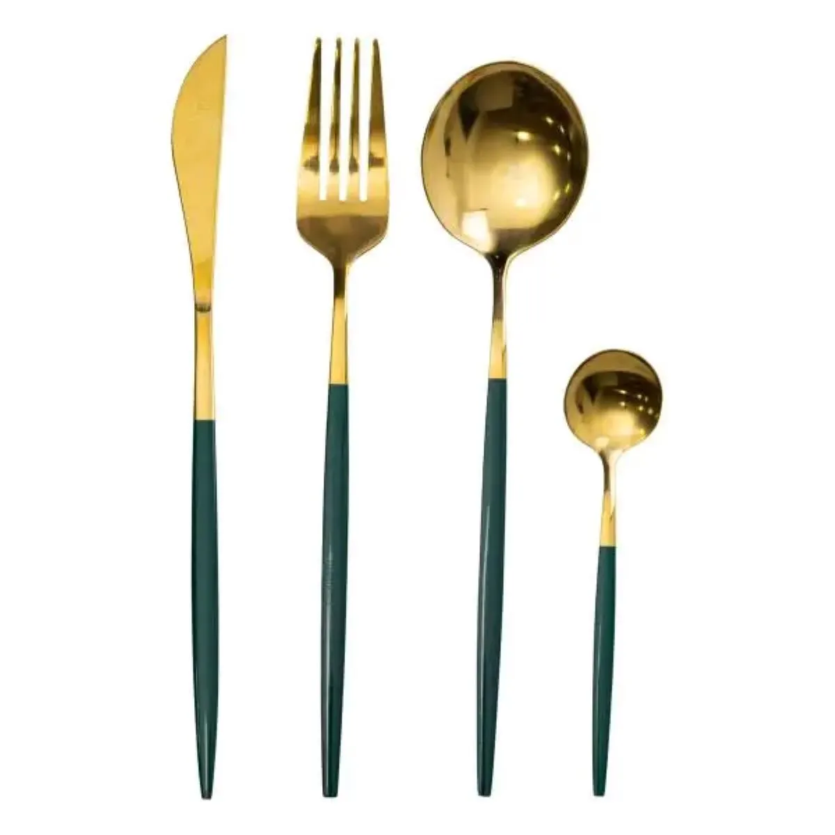 Набір столових приборів складається з 24 предметів і розрахований на 6 осіб. До комплекту входять столові ножі, виделки, ложки та чайні ложки, що забезпечує повноцінне оснащення столу для обіду або вечері. Основна частина приладів виконана з нержавіючої сталі золотистого кольору, а ручки — зелені, що надає їм сучасного стилю та привабливого зовнішнього вигляду.