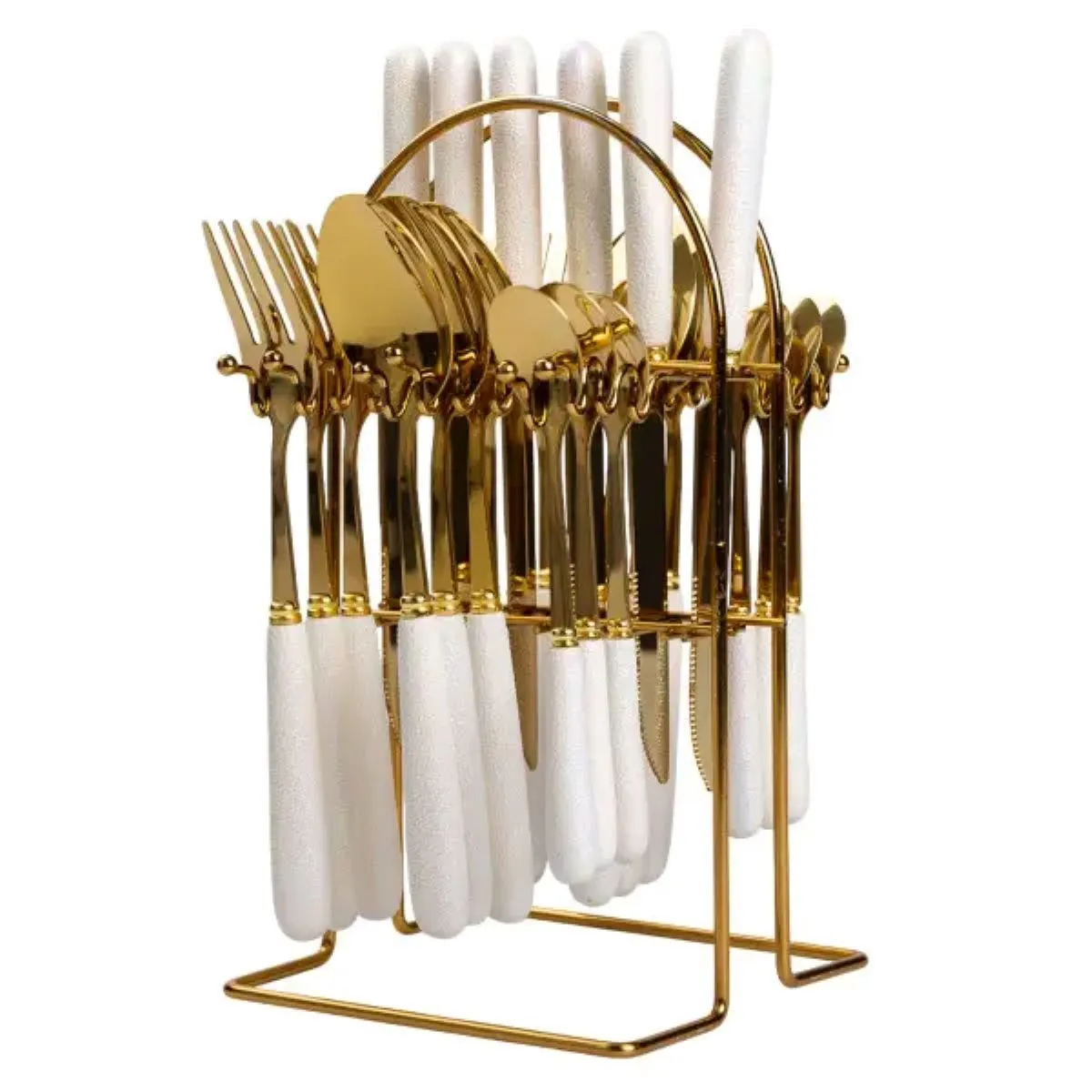 Набір столових приборів на підставці складається з 24 предметів, розрахованих на обслуговування шести осіб. Включає 6 столових ножів, 6 столових виделок, 6 столових ложок та 6 чайних ложок. Основний матеріал виробів – нержавіюча сталь із золотистим покриттям, що забезпечує довговічність і стійкість до корозії. Ручки виконані з білої кераміки, що надає комплекту вишуканого зовнішнього вигляду.