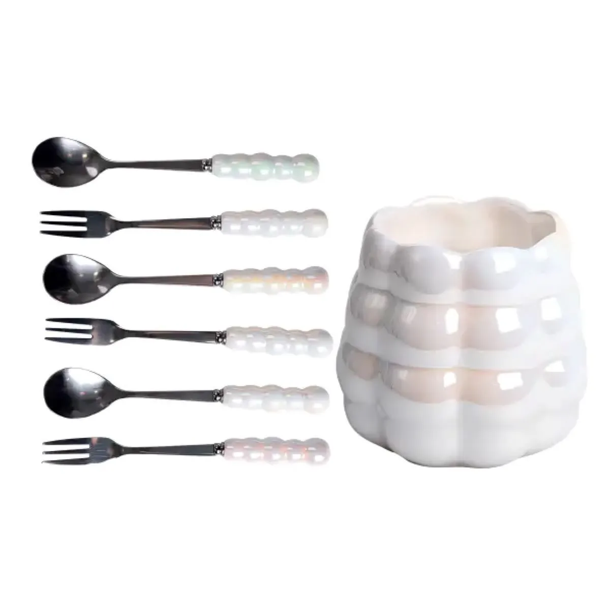 Набір десертних виделок і ложок на 3 персони з підставкою з кераміки 7 предметів Перламутровий HP-20-62