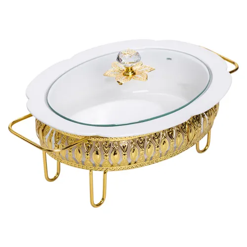 Фарфорова ємність славиться своїми теплоутримуючими властивостями та естетичним виглядом. Закрита скляна кришка з зручною ручкою дозволяє спостерігати за станом страви, не порушуючи температурний режим і зберігаючи аромат. Це робить мармітницю незамінним аксесуаром для тривалих чаювань, банкетів і фуршетів.