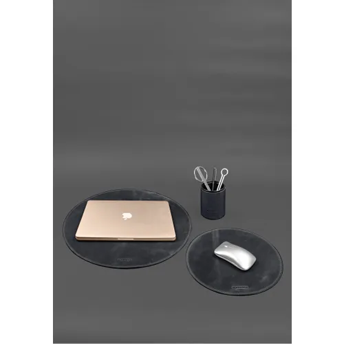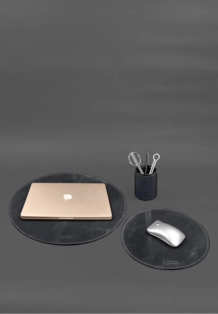 Даний шкіряний настільний набір включає три функціональні елементи: килимок під ноутбук, підкладку під пахву та шкіряну склянку для канцелярського приладдя. Вироби виконані з високоякісної натуральної шкіри Crazy Horse з ефектом вінтажної матовості, характерної для даної вироблення. Таким чином, набір одночасно поєднує практичність та виразний стиль, створюючи настрій та атмосферу на робочому столі.