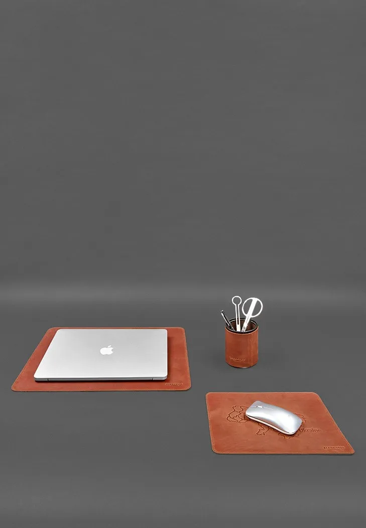 Шкіряний настільний набір з натуральної шкіри 5.0 з картою України світло-коричневий Crazy Horse включає три найважливіші аксесуари: килимок під ноутбук, килимок під пахву і шкіряний стаканчик для зберігання письмового приладдя. Всі елементи виготовлені з натуральної шкіри Crazy Horse з ефектом «вінтаж», що надає виробам неповторного вигляду та довговічності.