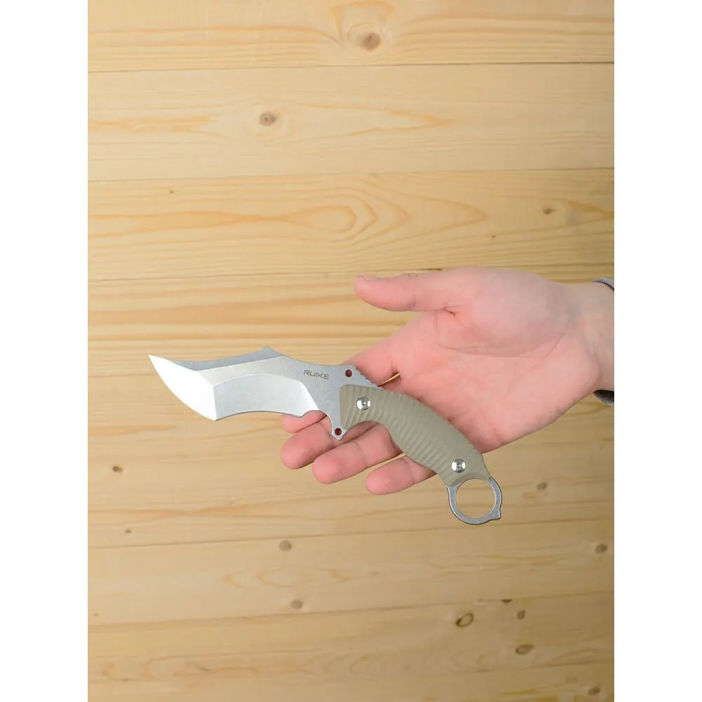 Ніж Ruike F181-W являє собою якісний фіксований ніж з оригінальною формою клинка типу "керамбіт". Ця модель ідеально підходить для тактичних завдань та активного відпочинку завдяки своїй ергономіці та надійному виконанню. Ніж випускається в кількох кольорових варіантах, серед яких виділяється чорний і піщаний відтінок рукояті.