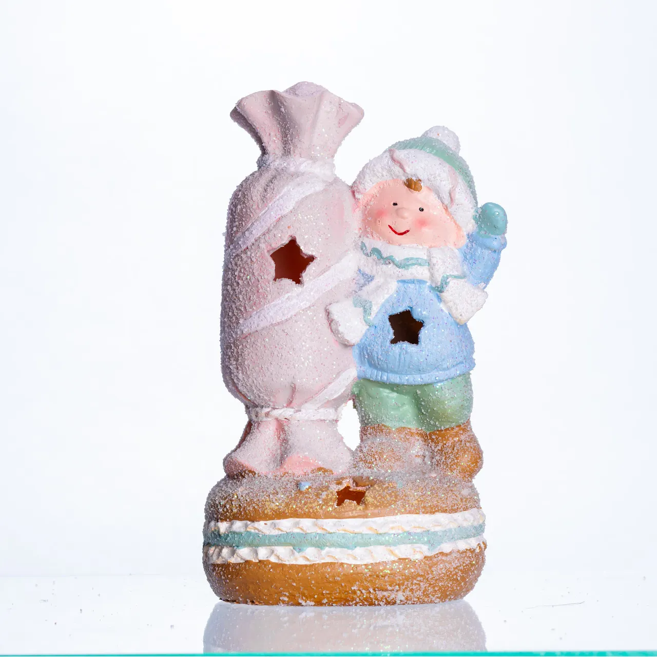 Деталі декору ретельно опрацьовані: одяг дитини виконаний у м’яких блакитних та зелених тонах, а м’ятна шапочка та коричневі чобітки додають образу живості. Велика цукерка прикрашена декоративними стрічками та вирізаними зірочками, крізь які пробивається м’яке світло LED-підсвітки. Крім того, вся поверхня фігурки покрита блискітками, що імітують м’який сніговий покрив, посилюючи святковий настрій.